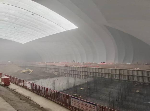此外,基坑气膜还能为施工人员提供一个恒温恒湿的舒适作业场域,减少因恶劣天气导致的工期延误与资源消耗,提高施工效率。同时,其智能化的控制系统更是提升了施工安全和环保的监管水平,为城市建设和环境保护的协调发展提供了有力支持。